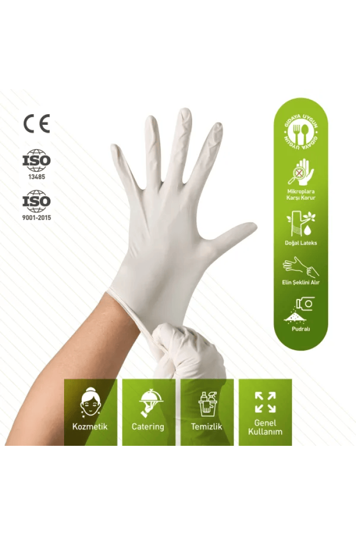 Pudralı çeşitleriyle, mikrop ve virüslerden korunmak amacıyla kullanıma uygundur. Elin şeklini alarak kolay hareket imkanı sağlar ve her iki el için de uygundur.