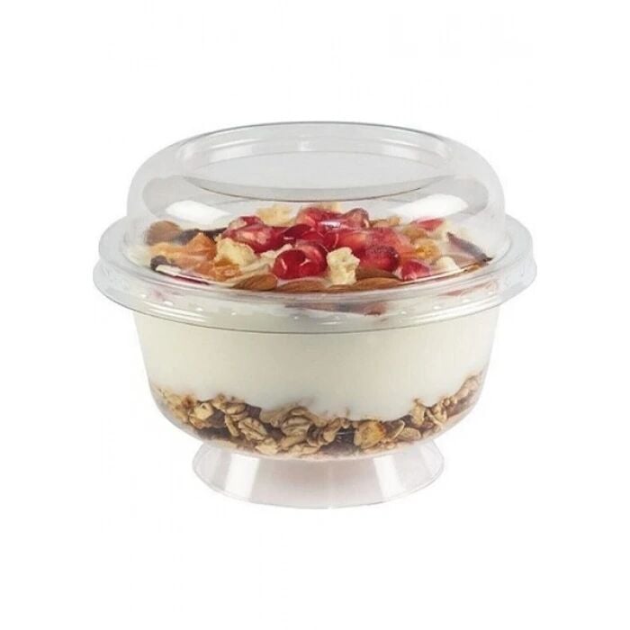 Kapaklı yapısı, hijyenik kullanım ve taşıma kolaylığı sunar. Tek kullanımlık kristal ayaklı kase, pastane, kafe, organizasyon ve özel davetlerde profesyonel sunumlar için idealdir. Gıda ile temasa uygun olarak üretilmiş olup, tatlı kapları arasında şıklığı ve pratikliği bir arada sunar.